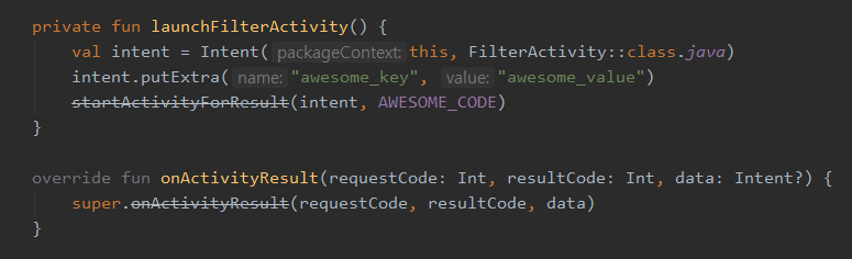 private fun launchFilterActivity() { val intent = Intent(this, FilterActivity::class.java) intent.putExtra("awesome_key", "awesome_value") filterActivityLauncher.launch(intent) }registerForActivityResult 메서드를 통해 Callback도 정의하고, ActivityResultLauncher를 만들었으면 위와같이 실행해주면 된다.