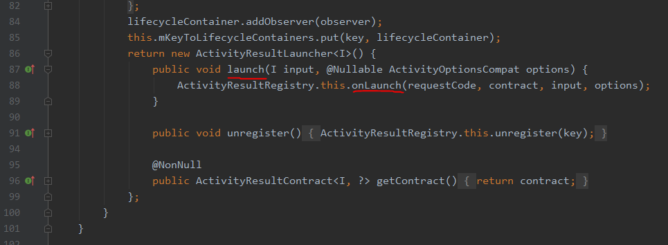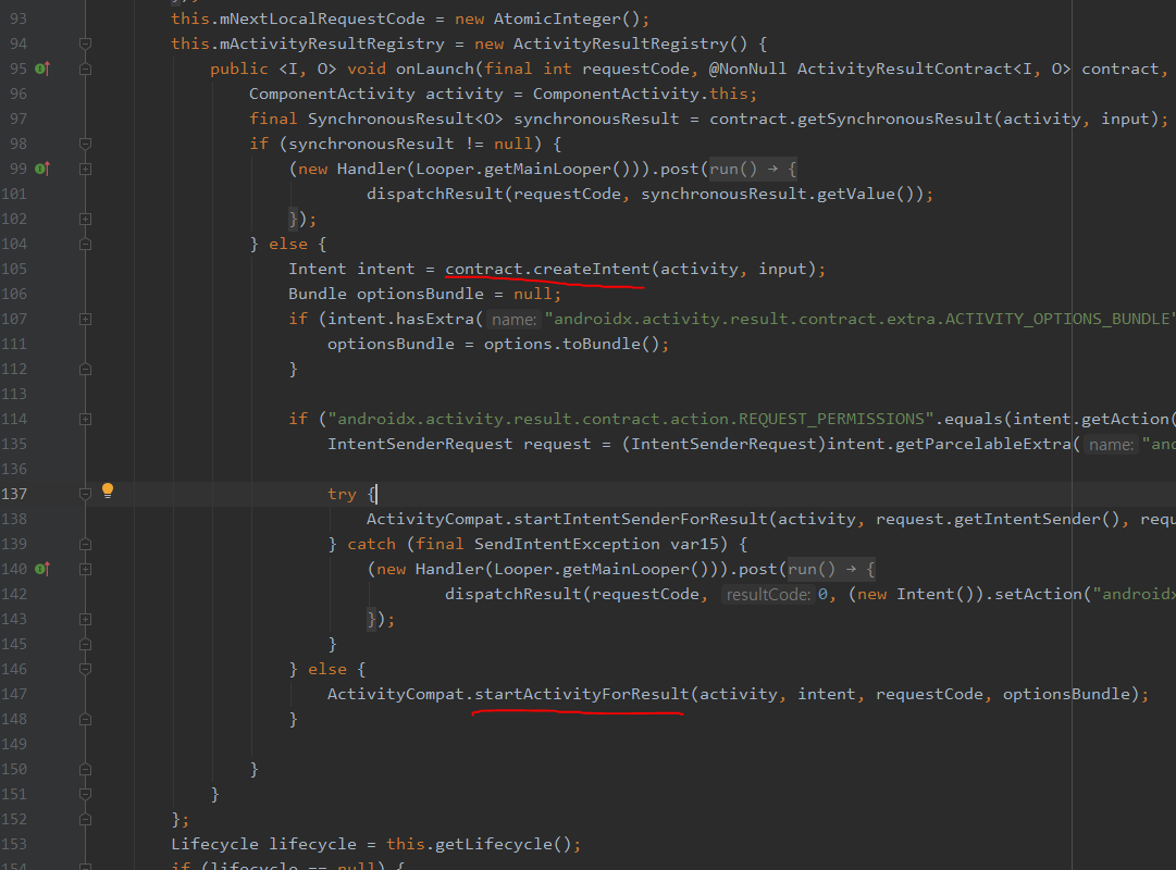 ActivityResultRegistry.class 파일 onLaunch 메서드에서는 전달받은 Contract(계약서)의 getSynchronousResult 메서드를 실행하므로써 sychronousResult 값을 받는다. (이미지는 부분 블럭 축소 했다.)