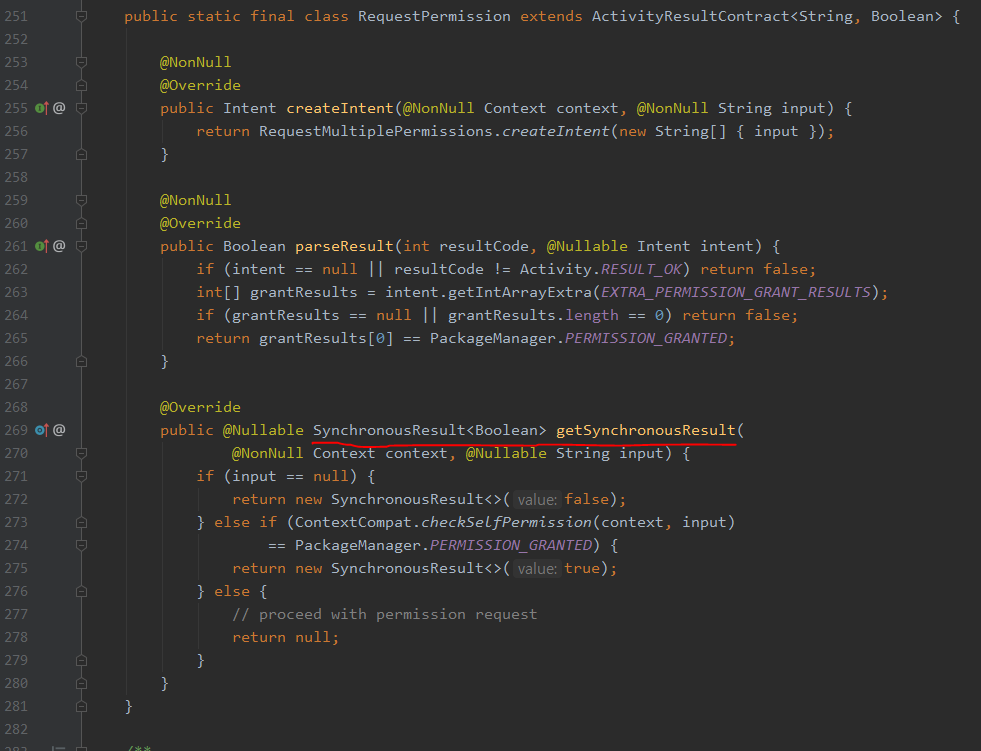 ComponentActivity.class 파일 권한 요청을 할 때 넣어주는 계약서 객체를 보면, 내부에 getSynchronousResult 메서드가 재정의 되어있는 것을 볼 수 있다.