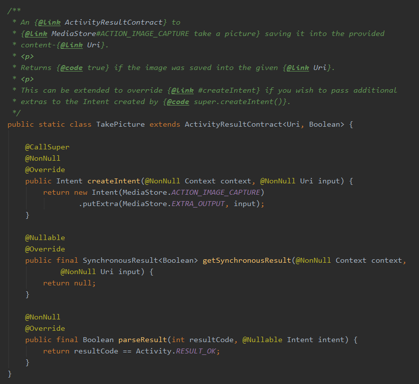 ActivityResultContract 클래스 내부를 들여다보면 미리 정의되어있는 "계약서" 객체들이 다형성을 이용해 미리 만들어져 있는 것을 확인할 수 있다.