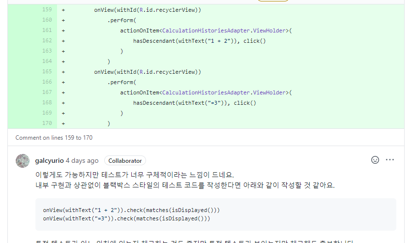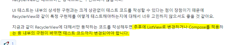 다시 생각해보면, Google에서 공식적으로 RecyclerView에 대한 테스트 유틸을 충분히 만들 수 있었을 텐데, 만들지 않은 이유가 바로 이러한 이유 때문은 아닐까 하고 생각이 든다.