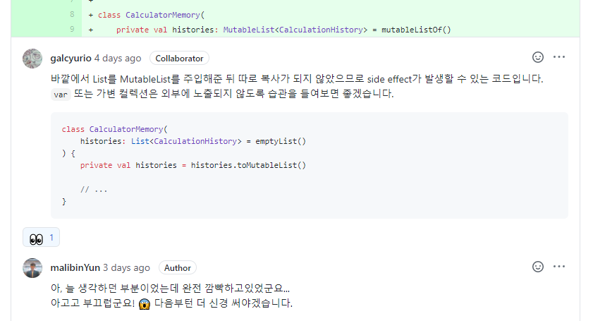 무튼, 리뷰어님의 설명대로, MutableList를 그대로 생성자 주입 해주면, 외부에서 해당 List의 참조를 갖고 리스트에 변형을 일으키면 (add, remove 등을 호출) CalculatorMemory에선 아무 일도 하지 않았는데 변경 사항이 생기는 매우 괴랄한 객체가 되어버린다.