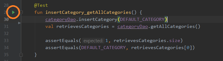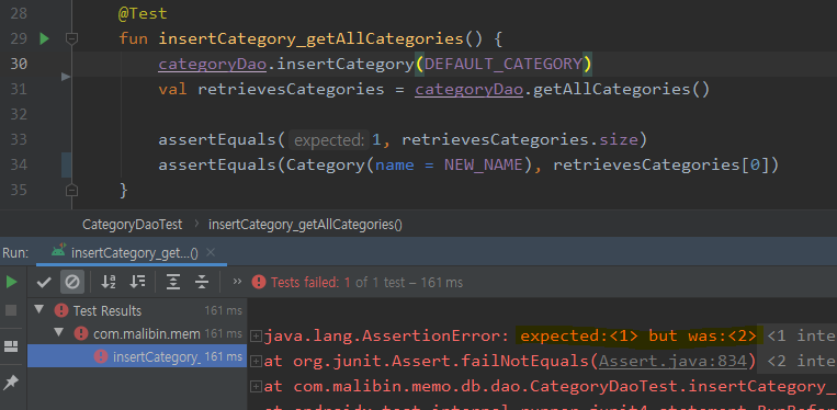 @Test fun insertCategory_replacesOnConflict() { categoryDao.insertCategory(DEFAULT_CATEGORY) val newCategorySameId = Category(DEFAULT_CATEGORY.id, NEW_NAME, NEW_COLOR) categoryDao.insertCategory(newCategorySameId) val retrievesCategory = categoryDao.getCategoryById(DEFAULT_CATEGORY.id) assertEquals(newCategorySameId, retrievesCategory) }- 카테고리 객체를 하나 insert 한다.
