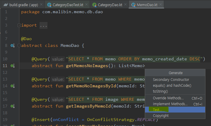 class TasksDaoTest { private lateinit var database: ToDoDatabase @Before fun initDb() { database = Room.inMemoryDatabaseBuilder(InstrumentationRegistry.getInstrumentation().context, ToDoDatabase::class.java).build() } @After fun closeDb() = database.close() ... }테스트 코드 생성