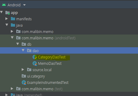 class CategoryDaoTest : KoinTest { private val database: AppDatabase by inject() private lateinit var categoryDao: CategoryDao @Before fun initCategoryDao() { categoryDao = database.categoryDao() } @After fun deleteCreatedCategory() { categoryDao.deleteCategoryById(DEFAULT_CATEGORY.id) } @Test fun insertCategory_getAllCategories() { // given categoryDao.insertCategory(DEFAULT_CATEGORY) val retrievesCategories = categoryDao.getAllCategories() // then assertEquals(1, retrievesCategories.size) assertEquals(DEFAULT_CATEGORY, retrievesCategories[0]) } @Test fun insertCategory_getById() { // given categoryDao.insertCategory(DEFAULT_CATEGORY) val retrievesCategory = categoryDao.getCategoryById(DEFAULT_CATEGORY.id) // then assertEquals(DEFAULT_CATEGORY, retrievesCategory) } ... companion object { private const val DEFAULT_NAME = "default category" private val DEFAULT_CATEGORY = Category(name = DEFAULT_NAME) private const val NEW_NAME = "new category" private val NEW_COLOR = Category.Color.BLUE.name } }주의사항