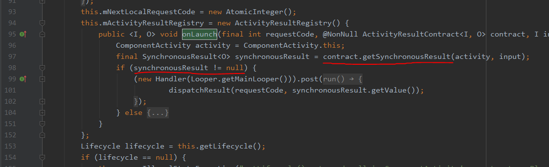 ActivityResultRegistry.class 파일 onLaunch 메서드에서는 전달받은 Contract(계약서)의 getSynchronousResult 메서드를 실행하므로써 sychronousResult 값을 받는다. (이미지는 부분 블럭 축소 했다.)