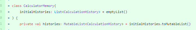 무튼, 리뷰어님의 설명대로, MutableList를 그대로 생성자 주입 해주면, 외부에서 해당 List의 참조를 갖고 리스트에 변형을 일으키면 (add, remove 등을 호출) CalculatorMemory에선 아무 일도 하지 않았는데 변경 사항이 생기는 매우 괴랄한 객체가 되어버린다.